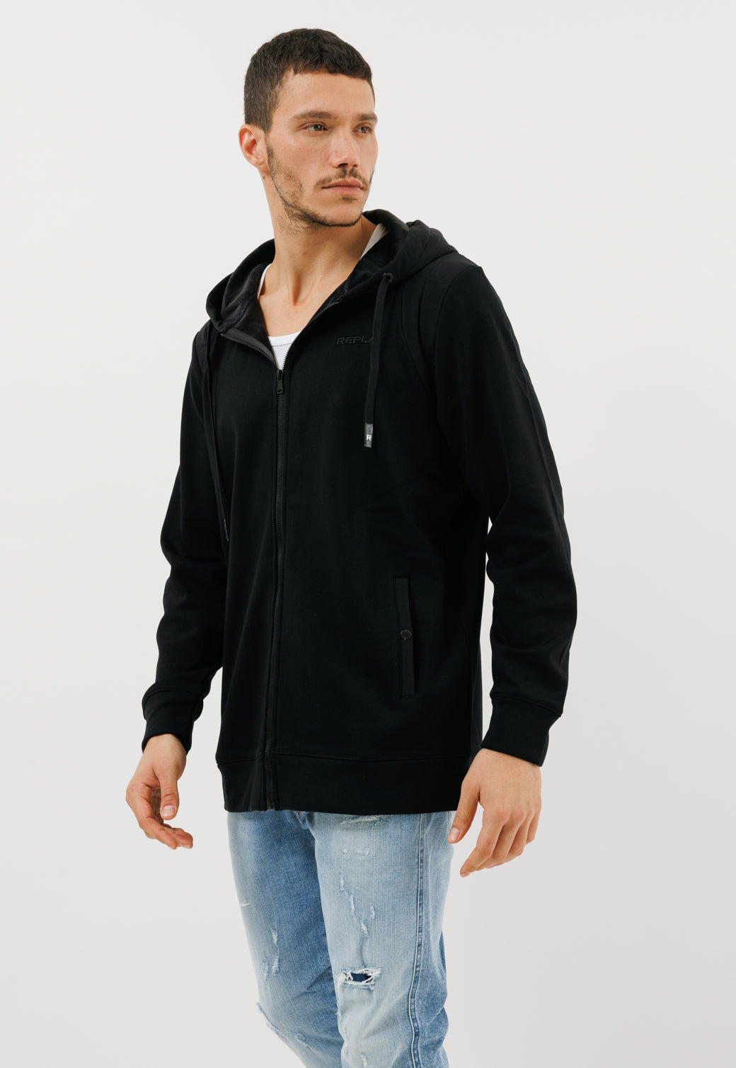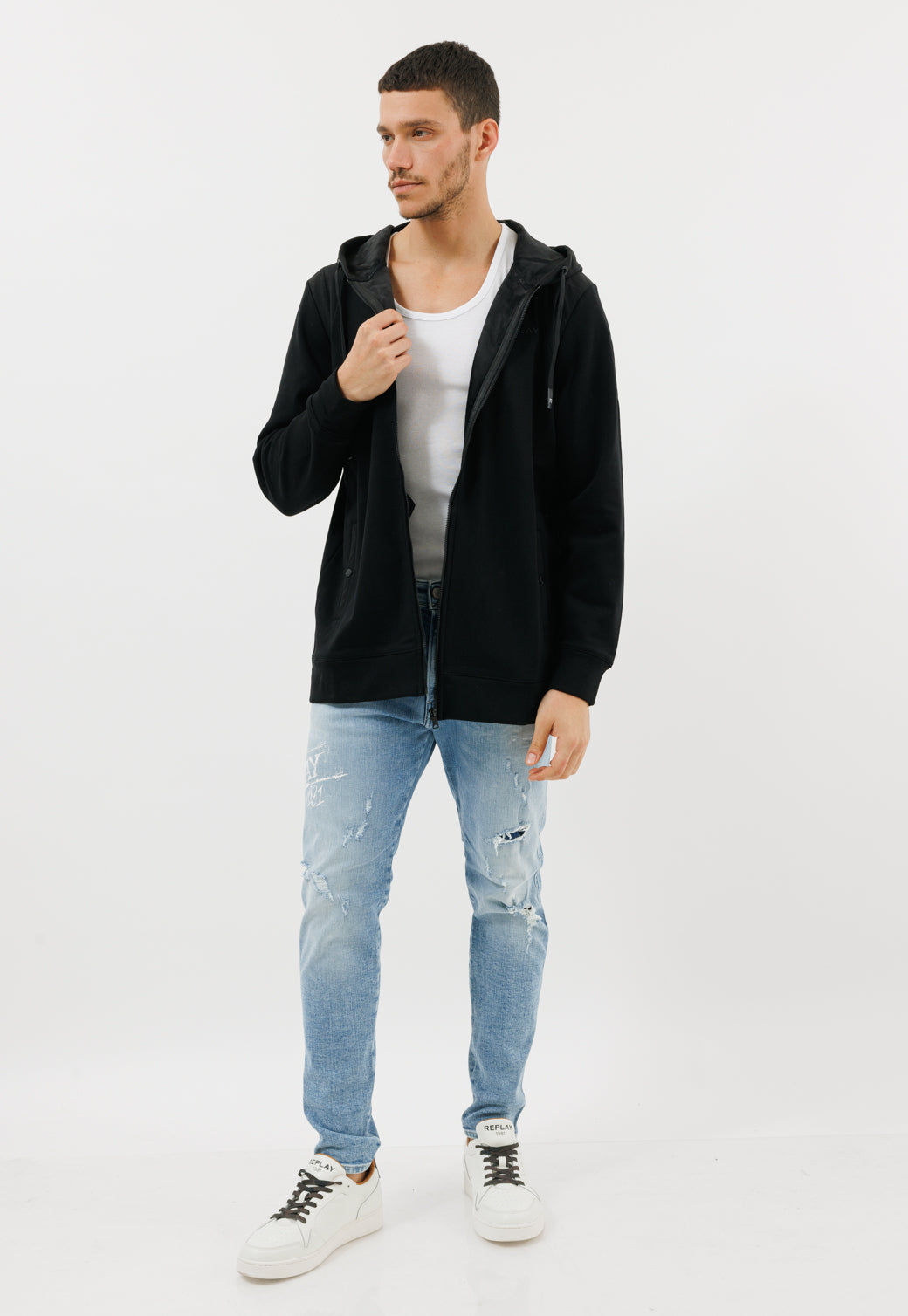 סווטשירט קפוצ'ון מרוכסן עם כיסים צידיים בסגירת תיקתקים. לסווטשירט בטנת קטיפה ורקמה במכפלת גב. גברים