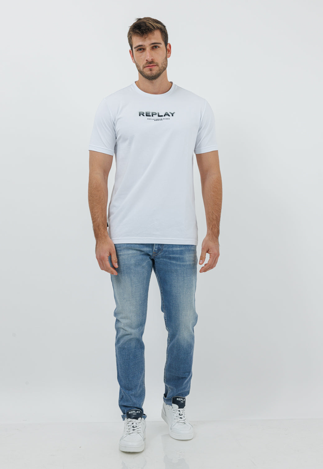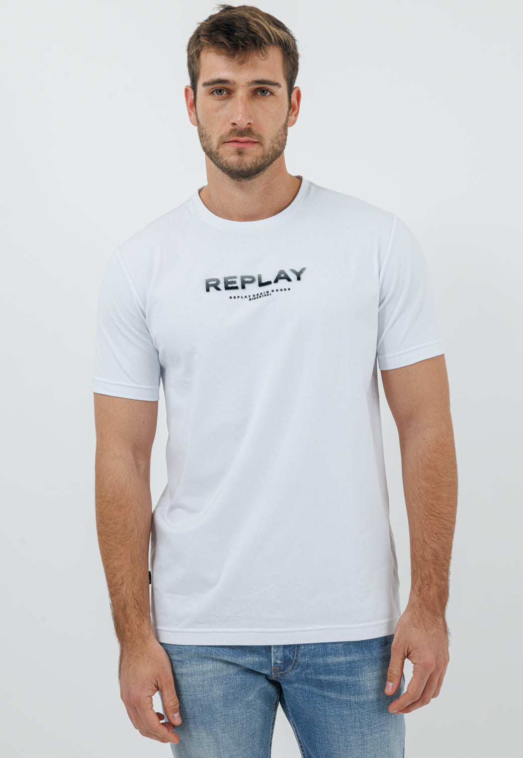 טי-שירט לבנה קלאסית לגברים, עם תוספת לייקרה לנוחות וגמישות מקסימלית. עשויה בד רך ונושם בגזרת סלים, עם הדפס לוגו REPLAY במרכז החזה למראה עדכני וספורטיבי. מתאימה לשילוב יומיומי עם ג’ינס, מכנסיים קצרים או מתחת לג’קט.