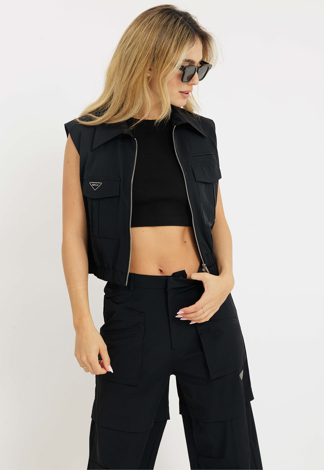 וסט מחויט לנשים מבית ריפליי בעיצוב קארגו אופנתי עם מראה אורבני ונועז. עשוי מבד טכנולוגי גמיש בטכנולוגיית 4WAY לנוחות מקסימלית ותנועה חופשית. כולל רוכסן קדמי, כיסים פונקציונליים עם דשים סגורים וכיתוב לוגו מעוצב. מתאים לשילוב עם מכנסי קארגו לאאוטפיט אחיד ומחמיא או כתוספת מגניבה לכל לוק יום-יומי.